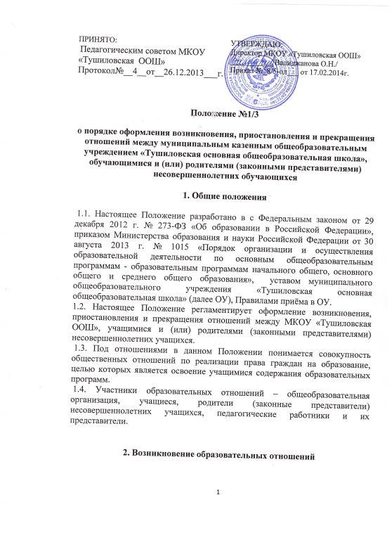 Порядок оформления возникновения, приостановления и прекращения отношений между образовательной организацией и обучающимися (воспитанниками) и (или) родителями (законными представителями) несовершеннолетних